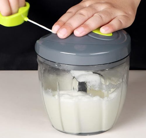 This genius gadget makes it simple to chop through veggies, blend and mix wet and dry ingredients, and to complete other timely meal prep tasks. Put everything you want to prep into the clear, 900-milliliter container, attach the blade of your choice, and pop the top on. Pull on the hand crank a few times to start chopping.
