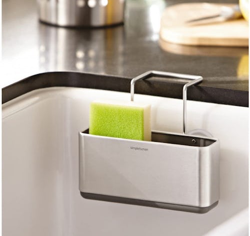 A stainless steel sink caddy that helps scrubbers dry quickly