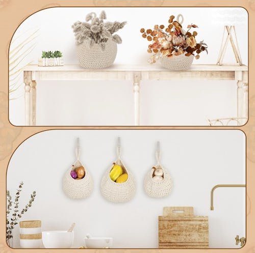 Not only can these hanging fruit baskets help you save a ton of counter space, but the macrame design also gives them a stylish appearance that’s sure to look good in just about any kitchen. They’re made from 100% cotton without a shred of polyester in sight — and each order includes traceless hooks so that you can hang them up right out of the box.