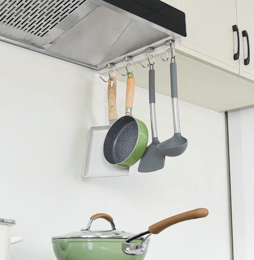 Brooms, mops, scrubbers — this organizer has space for all sorts of tools stored inside your utility closet. Hooks between each slot give you somewhere to hang up scrubbers and rags. Or, if your utility closet is already looking good, you can also use it to store sports and gardening equipment in your garage.