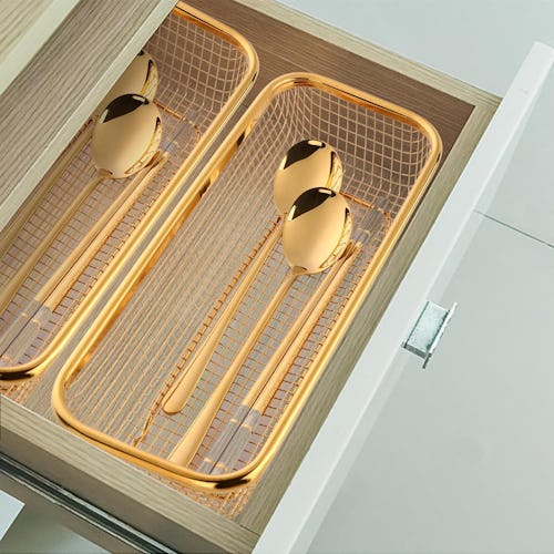 These drawer organizers are so shiny that you may even want to set them up on your counter, vanity, desk, or anywhere else they can be admired. They’re made of stainless steel mesh and complete with nonslip feet so that they stay in place (no matter where you end up placing them). Pick them up in gold, silver, rainbow, and other colors.