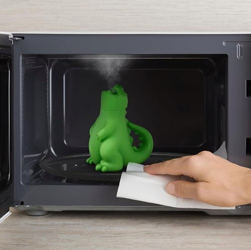 Fill this microwave cleaner with water, vinegar, and maybe even a bit of lemon to add a fresh scent and run the machine and this silicone dragon will release a mist. After you turn your appliance off, the grease and grime will have loosened, making everything much easier to wipe away.