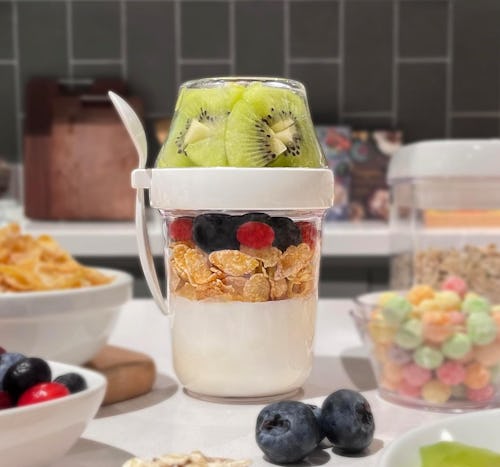 Whether you’re in the mood for a yogurt parfait, cereal, or nut mix, this shatter-resistant snack cup will make it easy to bring it with you when out and about. It has two separate compartments (neither of which will ever leak) and comes with a clip-on spoon. It’s dishwasher- and freezer-safe as well.