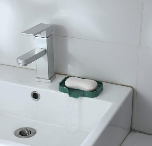 Place this soap dish right on the edge of your sink and all excess water will be funneled right back into your drain. There will be no mess to clean up and since it’s made of silicone, it will stay in place. Choose from different colors and sizes in the listing.