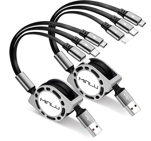 Since both ends of these multi-charging cables are retractable, they won’t take up nearly as much space as ordinary cables. They have a micro-USB, USB-C, and Lightning connector so you can charge three different devices at once. Your order comes with a pair of cables.