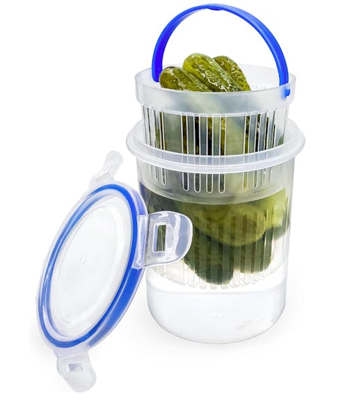 This 24-ounce pickle jar makes it easy to grab a snack without getting your fingers wet. It has a built-in strainer and a snap-on lid that will keep it from leaking.