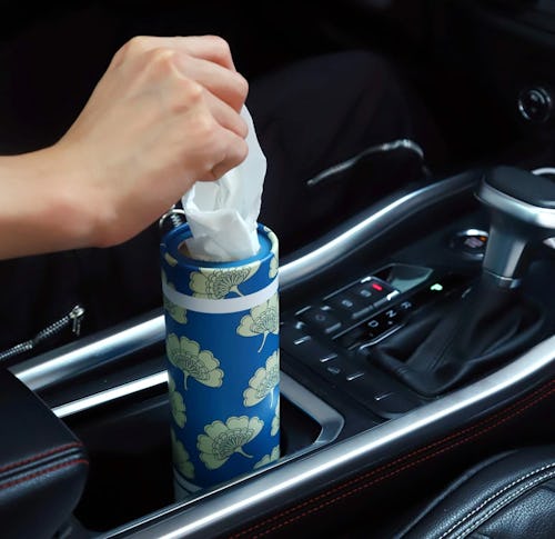 These four car tissue holders will fit perfectly in your cup holders and are filled with 50 sheets each that are durable and highly absorbent. Choose from two sets of patterns in the listing.