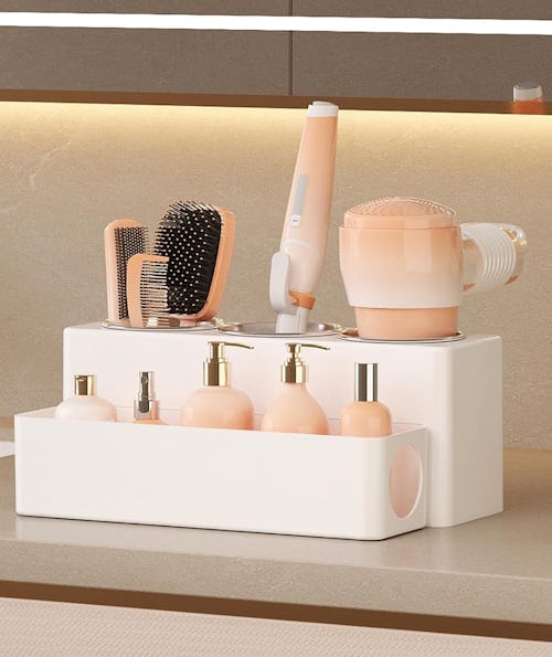 Use the three heat-resistant stainless steel cups in this tiered organizer to hold hot tools like your curling iron or blow dryer. Then, place products like hair spray, detangler, or serums in the front section — this way, everything you need is in one spot. The compartments can also be separated if desired. The organizer is also available in pink and black in the listing.