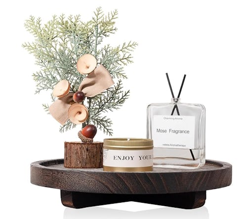 This decorative tray looks like it should cost far more than it does. It’s crafted from wood with a dark brown finish, round shape, and raised base. Use it functionally for items like perfume or makeup, or more decoratively for candles, plants, and other knickknacks.