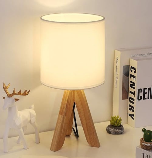 Compact by design, this tripod lamp takes up minimal space on your desktop, nightstand, vanity, or wherever else you decide to use it. It plugs into an outlet for power using the 5-foot power cord; the on/off switch is positioned on it. It comes in three neutral color schemes in the listing.