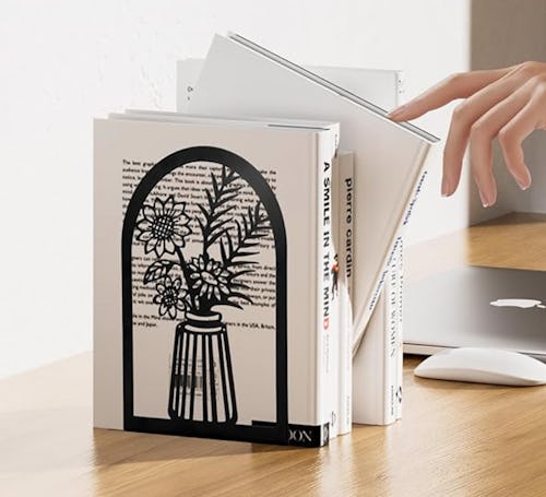 Keep your favorite books upright and orderly with these metal bookends that feature a flower and vase. The set includes six total bookends (so three pairs) with varying designs. Each one has nonskid foam pads on the bottom to stop it from sliding, even under the weight of many books.