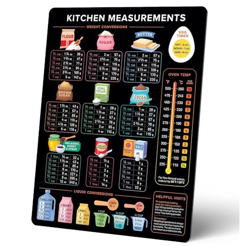 Keep this conversion chart within view when you’re baking or cooking; it’s magnetic so that you can display it on your fridge. The chart shows the most useful conversions for various ingredients, including liquid measurements.