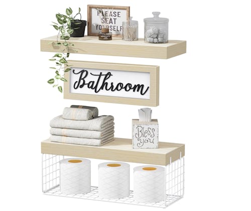 These floating shelves are designed for placement near a toilet. One of the two shelves has a metal basket below to hold several rolls of toilet paper. This is the natural finish option, but others (including black or white) are purchasable in the listing.