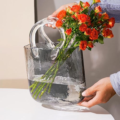This glass vase looks like your favorite tote but it’s able to hold a large bouquet of flowers, stand securely on your table, and look gorgeous. You could also use it to serve punch, as a candy dish, or whatever you feel inspired to do. It comes in four translucent shades.