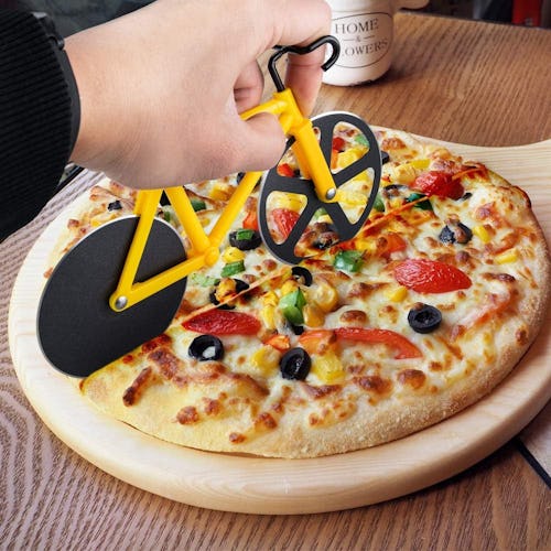 Why not turn pizza night into a fun, bike ride through dough and pepperoni? This bicycle pizza cutter will slice through a crispy crust, cut the toppings without dragging them off, and allow you to voice your character as it enjoys a bumpy bike ride through sauce. It stands on its own bike stand when not in use. It comes in five colors.