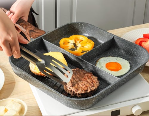 Dirty fewer dishes and get your entire meal done at once with this divided grill pan. Three different foods can be kept separate and nothing will stick because of the nonstick coating. The largest section has raised ridges so that excess grease and oil can be filtered out. The 9.5-inch pan is free of PFOA and PFOS, and it comes in a few larger sizes in the listing.