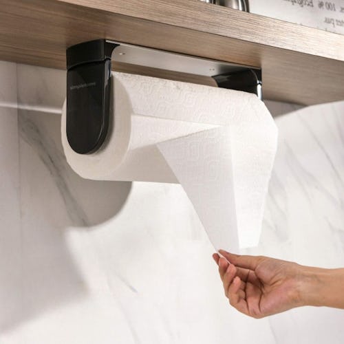 You’ll only need one hand to rip off a piece from this paper towel holder that has earned a 4.8-star overall rating. It can be installed underneath your cabinets or on your wall using the included adhesive or screws. Choose from silver, white, and black in the listing.