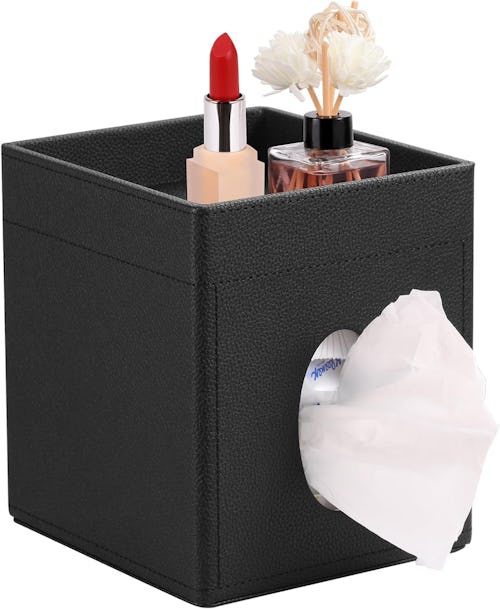 Complete your vanity or desk with this faux leather tissue box cover that’s so sophisticated that it can be considered decoration. It even has a top shelf where you can place a picture frame or your everyday items like lotion and sunglasses. It comes in black, brown, and gray in the listing.