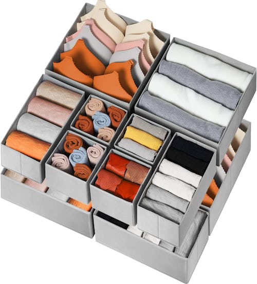Get your chaotic clothing drawers in order with these drawer dividers. The set includes 12 bins in three sizes, providing a tidy place to fold clothing, undergarments, and accessories. Each organizer is made from durable nonwoven fabric and collapses down for convenient storage when not in use.