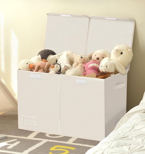 Reduce clutter in your home with this lidded chest whose neutral color will fit with any color scheme and decor style. The chest has sturdy cardboard sides which are covered with wrinkle-resistant fabric that stays shut using strong hook-and-loop strips. You can insert a label in its built-in clear label slot and easily move the chest from one spot to another thanks to the sturdy side handles.