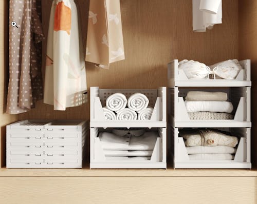 Organize your space and group items by category with these plastic storage baskets whose stacking design allows you to utilize vertical space in closets and cabinets. They are made from heavy-duty plastic and the bottoms slide out halfway like drawers, so you can easily retrieve stored items. You can stack multiple baskets on top of the other and fold them down when they’re not being used.