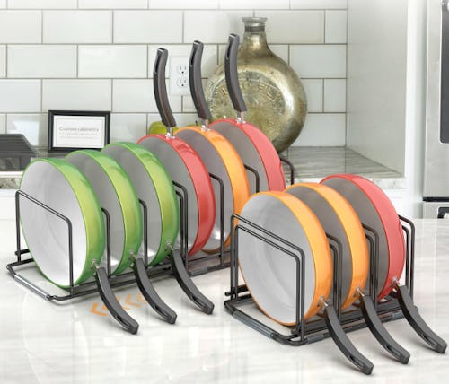 Pots and pans can easily clutter kitchen cabinets, which is where this clever adjustable pan organizer comes in handy. Constructed from sturdy alloy steel and featuring a stable base, the metal organizer can be extended from three to six compartments depending on the depth of your cabinet and the number of pans you’re storing. Besides cooking pans, the organizer can also be used to hold cutting boards, trays, and baking sheets.