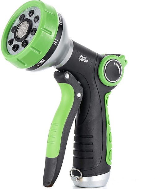 Get the job done with ease using this spray nozzle. Made of durable materials, it fits all 0.75-inch standard garden hoses. Once the nozzle is connected, you can water plants or wash your cars and windows, choosing from eight watering patterns to suit your needs. A flow control knob on the sprayer lets you regulate the amount of water flowing through the nozzle.