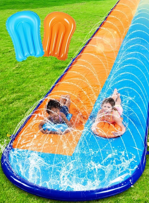Dive into the ultimate backyard fun with this double-wide lawn waterslide. Measuring a whopping 22.5 feet, this slide ensures an extended slippery ride that ends with a splash in the cool pool. Made from heavy-duty PVC, it's built to last through every giggle-filled race. Easy to set up with a built-in sprinkler system, it guarantees hours of refreshing fun.