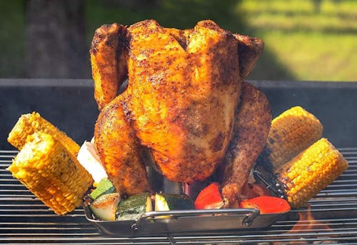 A roaster stand that helps you cook delicious beer can chicken