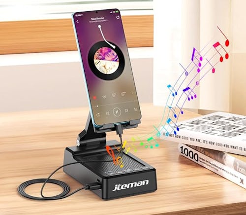 A phone stand, charger, & speaker in one