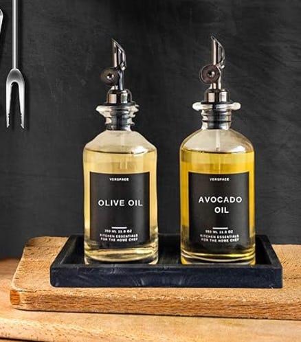 These glass dispenser bottles are a leveled-up spot for oils, vinegars, condiments, and other liquids. The leak-proof pouring spot is a much better way to pour these out than the bottles they come in, offering less mess and making them a breeze to use. These bottles also come with 40 labels that will cover almost any oil you might use.