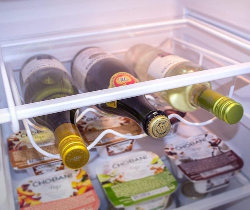 Keep up to three bottles of wine chilled with this clever under-shelf wine rack. It carefully cradles your vino and hooks over the top of a shelf so it can hang safely beneath it, thereby saving shelf space. Better yet, this sturdy metal wire rack has a crisp white finish to match the rest of your fridge.