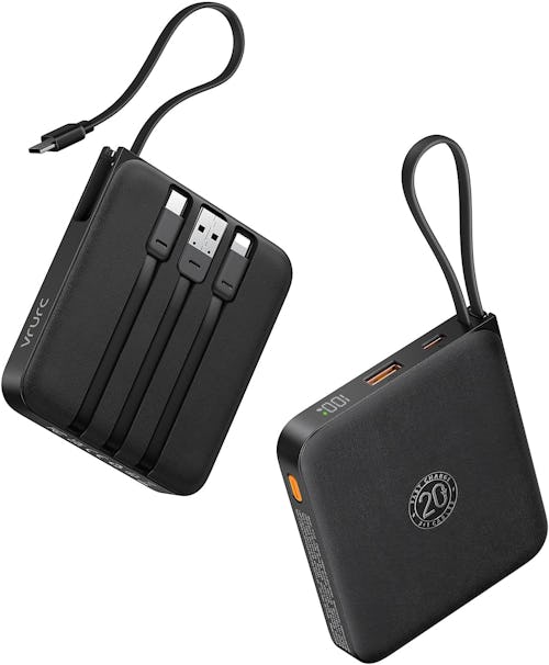 This mini portable charger is the perfect companion to stash in your car or take with you on your next trip. It comes with four cables that are attached and ready to use: micro-USB, Lightning, USB-A, and USB-C. It even features a display screen that shows the battery percentage, so you can always keep an eye out for when it needs a charge.
