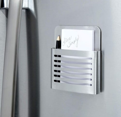 Keep your essentials within reach thanks to this magnetic pocket holder. It has an attractive stainless steel design with striped cutouts that let you keep an eye on your supplies. It’s great for housing grocery lists, writing implements, storage clips, or anything else you like to keep on hand in the kitchen.