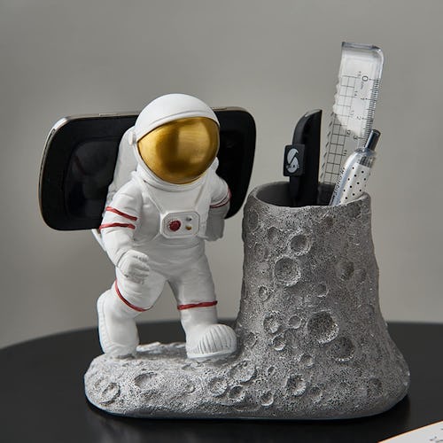 Create an aesthetically pleasing home for all your writing implements with this astronaut pen holder with a phone stand. The lunar-themed dish, complete with little craters, makes the perfect spot for stashing not just pencils but scissors, rulers, or anything else you need to keep handy. Your phone will fit perfectly on the astronaut’s back, mimicking the look of a jet pack.