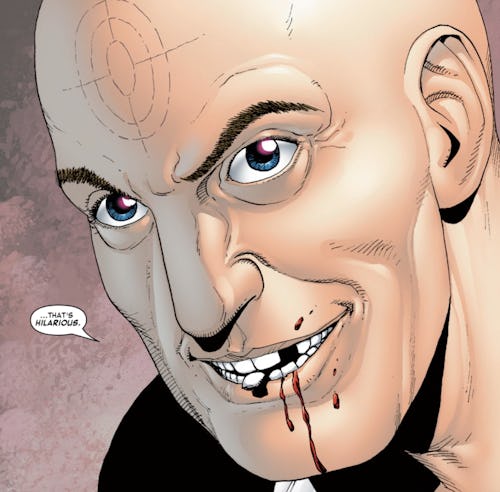 This particular Bullseye look may be signaling a big season finale moment. We see the villain baring his teeth: his bloody smile is full of gaps, and he’s holding a tooth. In the 2005 comic Bullseye: Greatest Hits #5, Bullseye is imprisoned and left without access to anything he can turn into his trademark projectile weapons. Faced with no other options, he finds a creative solution: dislodging one of his own teeth and spitting it with enough force to pierce a skull.