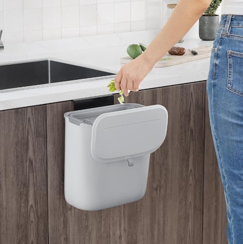 Cleaning your counter and getting rid of waste will be much easier when you have this hanging trash can attached to the cabinet directly below you. Everything can be pushed right in and since it can hold 2.4 gallons, you won’t need to empty it very often. It has a hook for damage-free hanging on any cabinet door.