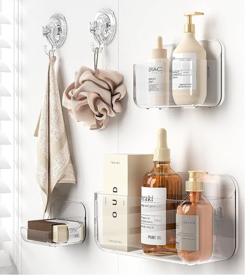 If you need extra storage but hate the cluttered look of bins, these shower shelves are for you. Their acrylic walls give them a barely-there appearance that will make your bathroom feel more spacious. They come in a set of five pieces that includes two shelves, two hooks, and a soap dish.
