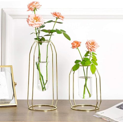 This pair of vases have hanging glass tubes and geometric iron frames so they’ll look like art, even when they’re not holding flowers. They’re available in matte black, gold, and rose gold.