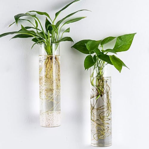 Keep things simple with these glass plant terrariums that draw all attention to the greenery instead of the holder. Since they’re clear, they create the unique experience of being able to watch the roots grow. Use the built-in holes in the back to hang them on any nail.