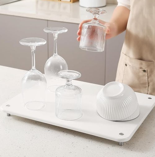 This piece is so chic that guests may not even realize that it’s a stone drying mat. However, when your dishes are ready to put away in a shorter amount of time than usual, you’ll be glad that it is. The diatomaceous earth material has great absorbency and will make drips disappear so it never looks wet or dirty.