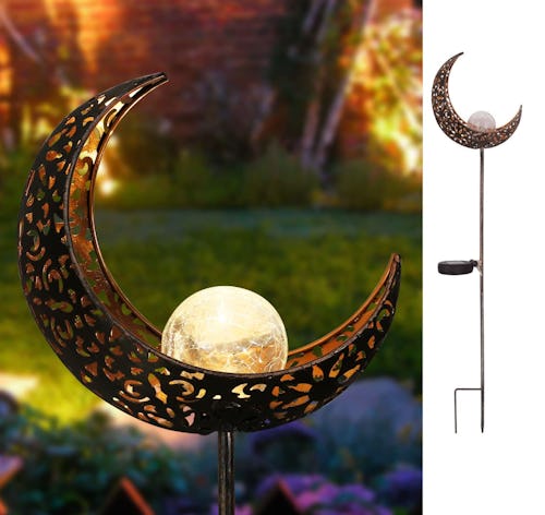 Create a magical ambiance with this moon-shaped solar light that’ll illuminate your backyard for up to eight hours. It’s crafted from antique metal and crackled glass for a beautiful finish and weather-resistant design. The 40-inch tall light has spikes that stake into the ground and since it’s solar-powered, there’s no need for messy-looking cables and extension cords.