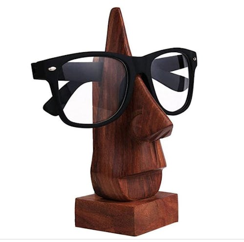 This glasses stand is carved from mango wood in India and features a stunning sculptural design. The carved wood sculpture is made to look like a face and safely holds one pair of glasses. It makes a great design statement on a desk or nightstand. It’s also practical in that it helps prevent scratches on the glass and makes your favorite pair much easier to find.
