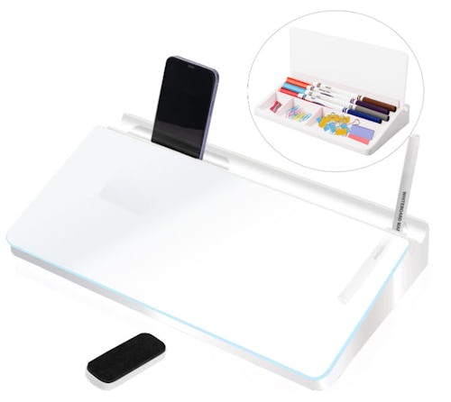 Write notes and reminders on this glass desktop computer pad which has a clean erase surface. It’s angled to make it easy to write on and includes two dry-erase markers you can store in the hidden pull-out drawer. The glass surface is smooth and durable, keeping its crystal-clear appearance throughout years of use.