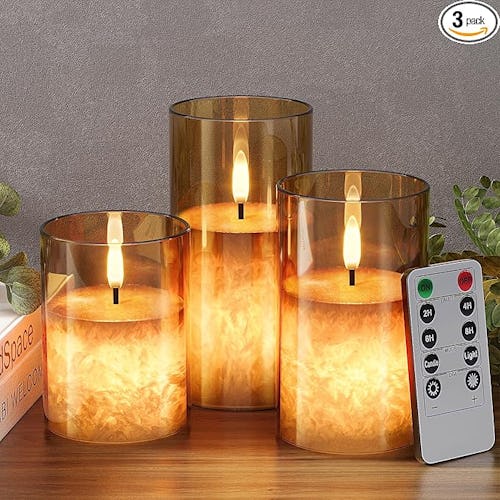 Get the ambiance without the fire hazard and replace regular pillar candles with this trio of flameless candles. The set includes three different size candles which have incredibly realistic flickering wicks and elegant gold glass containers. The candles are battery-powered and include a handy remote which has a dimmer, timer, and an on/off button.