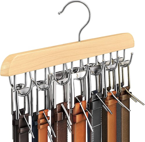 Free up closet space with this space-saving belt hanger that holds up to 42 belts. It has a sturdy stainless steel and wood construction so it won’t buckle under the weight of your belt collection and hangs on a rotating hook for easy access. The hanger is double-sided and has 14 hanging hooks, each of which can accommodate three standard belts.
