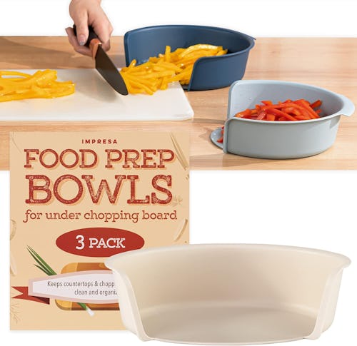 These food prep bowls are designed to make meal prep easier and minimize cleanup time. They are made from food-safe plastic (which is dishwasher-safe) and easily slide under chopping boards to help transfer ingredients quickly and without making a mess. The bowls have built-in handles and are stackable for space-saving storage.