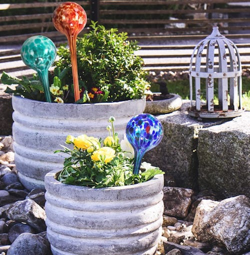 Decorative hand-blown glass globes that can water plants for up to 2 weeks