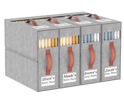 Your linen closet will look like it was organized by a pro when you use these beautiful bed sheet organizers. They have an elegant gray linen exterior with clear front panels so you can see what’s inside and a slot for a label for a professional finishing touch. Each organizer fits one full bed sheet set and has two leather-like handles for easy carrying.