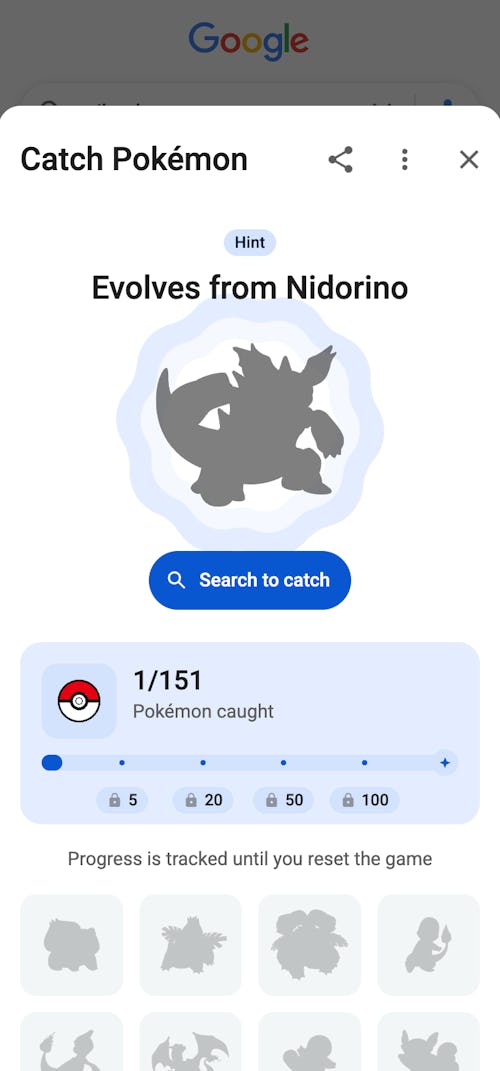 If you don’t know all 151 original Pokémon off the top of your dome, you could always just pull up a big list of all their names and catch them up by one, but there’s actually a much more fun way to play Google’s new game. Whenever you catch a Pokémon, you’ll also be able to see how many are left to capture before you have all 151. You can then click through to a hint about one of the Pokémon you’re missing. In Google’s example, you’re shown an outline of Nidoking in the style of the “Who’s That Pokémon?” segment from the original anime, along with the hint “Evolves from Nidorino.” While just searching for different Pokémon and clicking a Pokéball isn’t much of a game on its own, challenging yourself to remember as many as you can on your own and filling in the blanks with the provided hints should make it much more interesting.